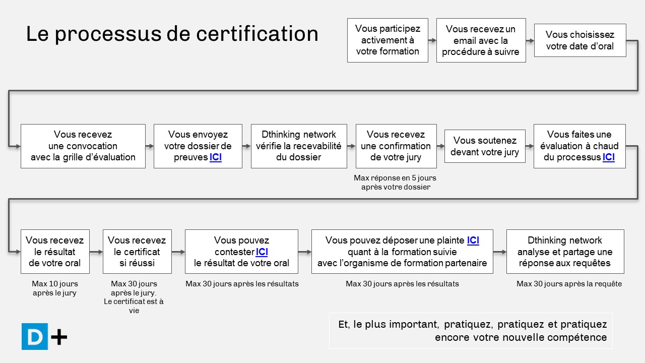 You send it to the D+HINKING CERTIFICATION certification body with the link provided by the trainer. Within 5 days, you will receive a confirmation.