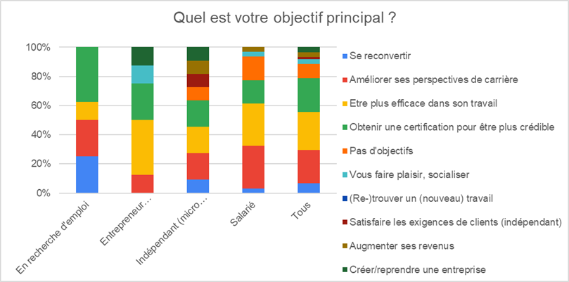 En analysant plus finement, la certification est importante principalement pour les entrepreneurs et ceux en recherche d’emploi. Ceux en recherche d’emploi et les salariés cherchent à améliorer leur perspective de carrière aors que les entrepreneurs cherchent à être plus efficace.